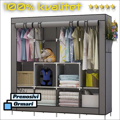 Dolazi u paketu i lako ga je sastaviti (oko 10 -15 minuta, nije potreban alat),vrlo uredan I lak pristup .Prekrivač od netkanog materijala omogućava slobodnu prozračnost odeće Lako se čisti i održava. Sastoji se od laganog, ali stabilnog cevastog čeličnog okvira i izdržljivog prekrivača od netkanog materijala. Idealan dodatak za gostinsku / rezervnu spavaću sobu, studente, i gde god je potrebno brzo rešenje za garderobu.Rolo vrata jednostavna za upotrebu.