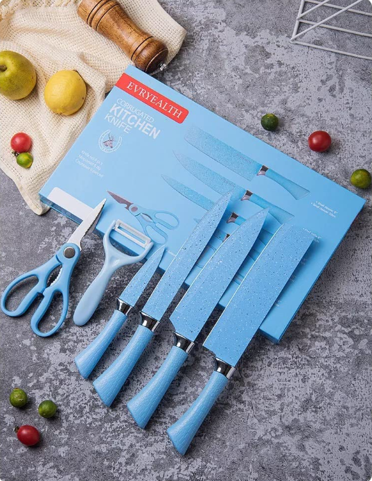 Unesite stil i funkcionalnost u svoju kuhinju uz ovaj vrhunski EVRYHEALTH kuhinjski set. Set uključuje sve što vam je potrebno za svakodnevno kuvanje – od preciznih noževa različitih veličina, do praktičnih makaza i ljuštilice. Sečiva su izrađena od visokokvalitetnog nerđajućeg čelika sa premazom koji olakšava sečenje i čišćenje. Ergonomske plave drške pružaju udobnost i sigurnost pri radu.