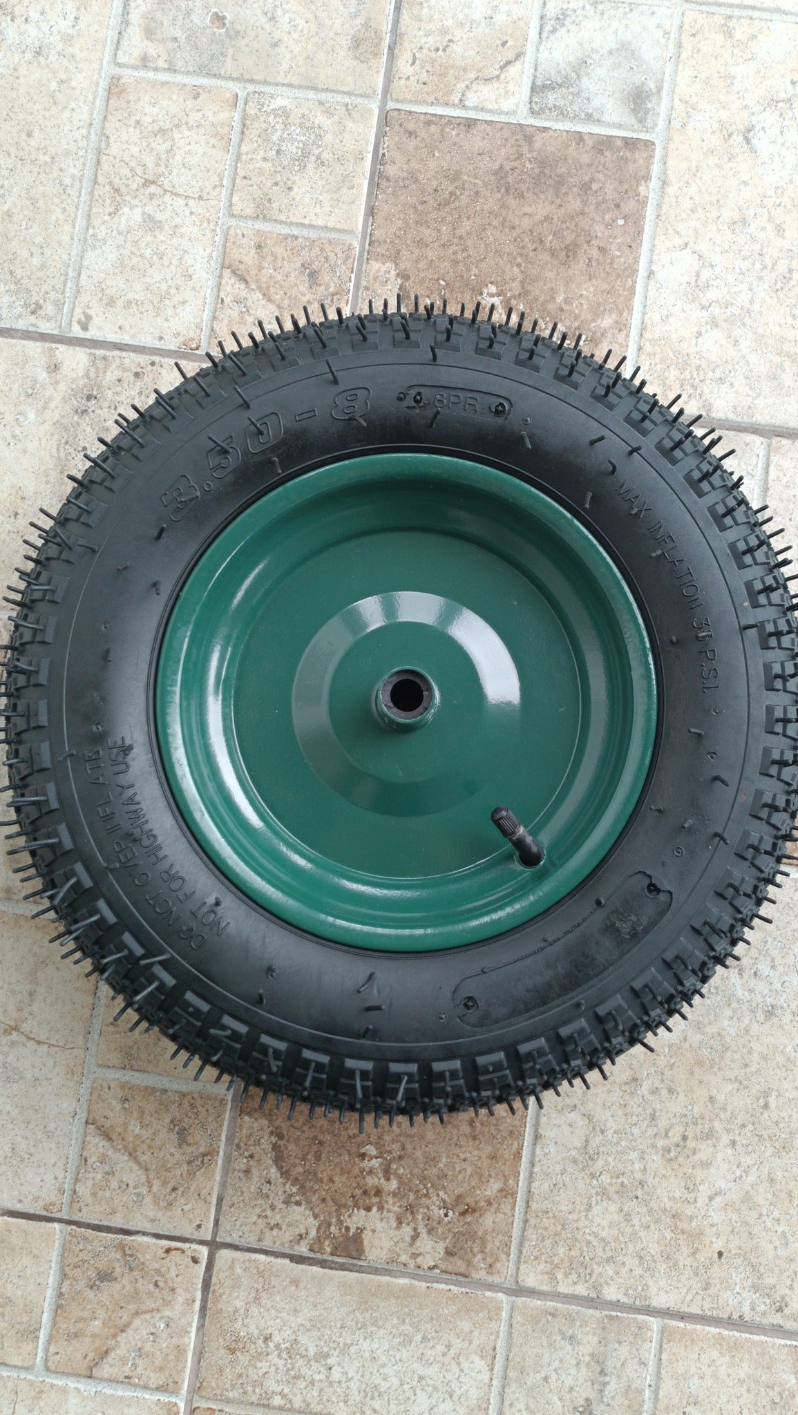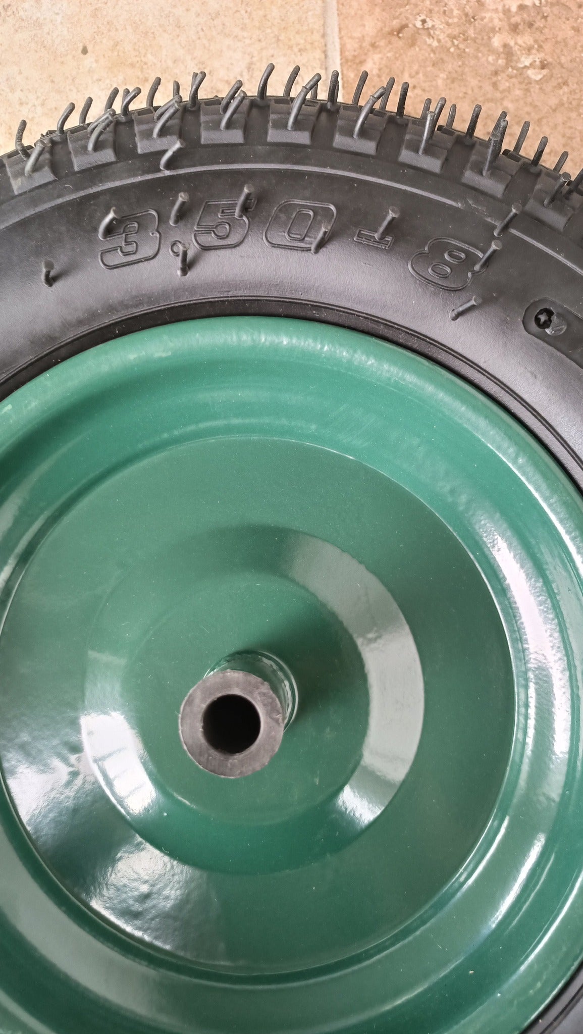 Točak dimenzija 3.50-8, idealna za razne vrste vozila poput kolica, vrtnih alata ili manjih prikolica. Guma je sa čvrstim, zeleni naplatkom i posjeduje čep za inflaciju, omogućujući lako podešavanje pritiska. Sa svojom robustnom konstrukcijom i oštrim šarama, pruža odličnu vuču na različitim terenima.